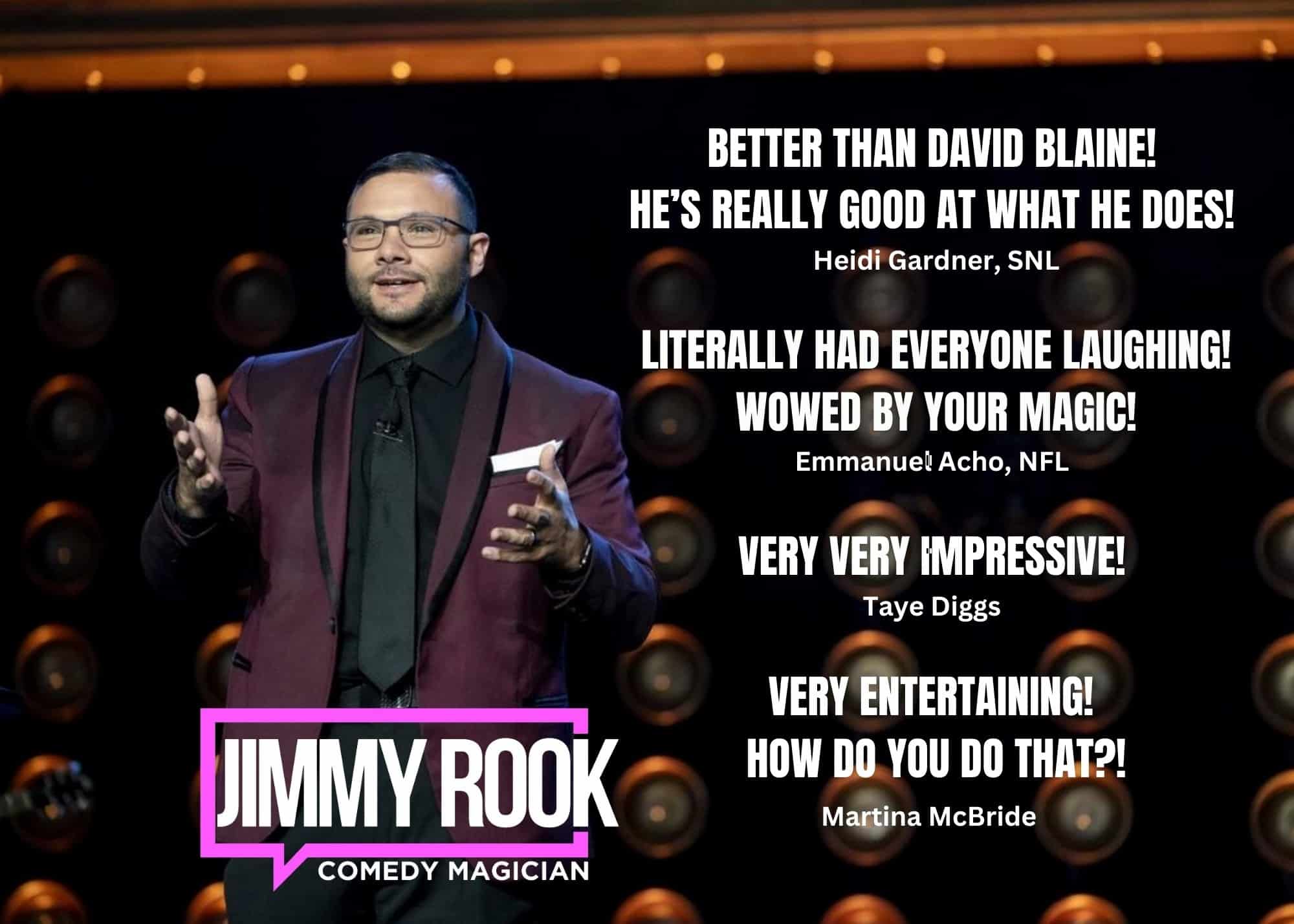 Jimmy Rook is a dynamic magician, mentalist, and comedy entertainer whose performances have amazed audiences nationwide. Based in Orlando, Florida, Jimmy has been featured on NBC’s America’s Got Talent, HBO/MAX’s Second Chance Stage, and has performed for the last ten years at the world-famous “Outta Control Magic Dinner Show”, voted America’s best magic show by the Travel Channel.